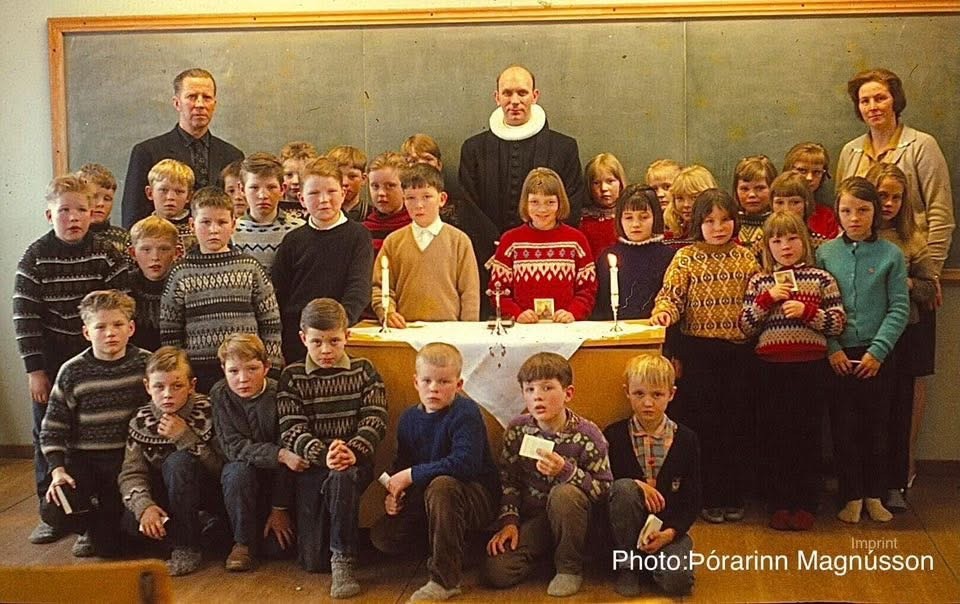 Þessa mynd tók skólastjórinn af okkur og fleirum á góðri stund í barnaskólanum. Hún var birt í Litla-Bergþór, blaði ungmennafélagsins og fengin hér að láni.
