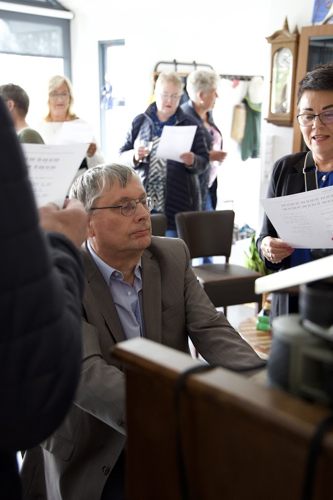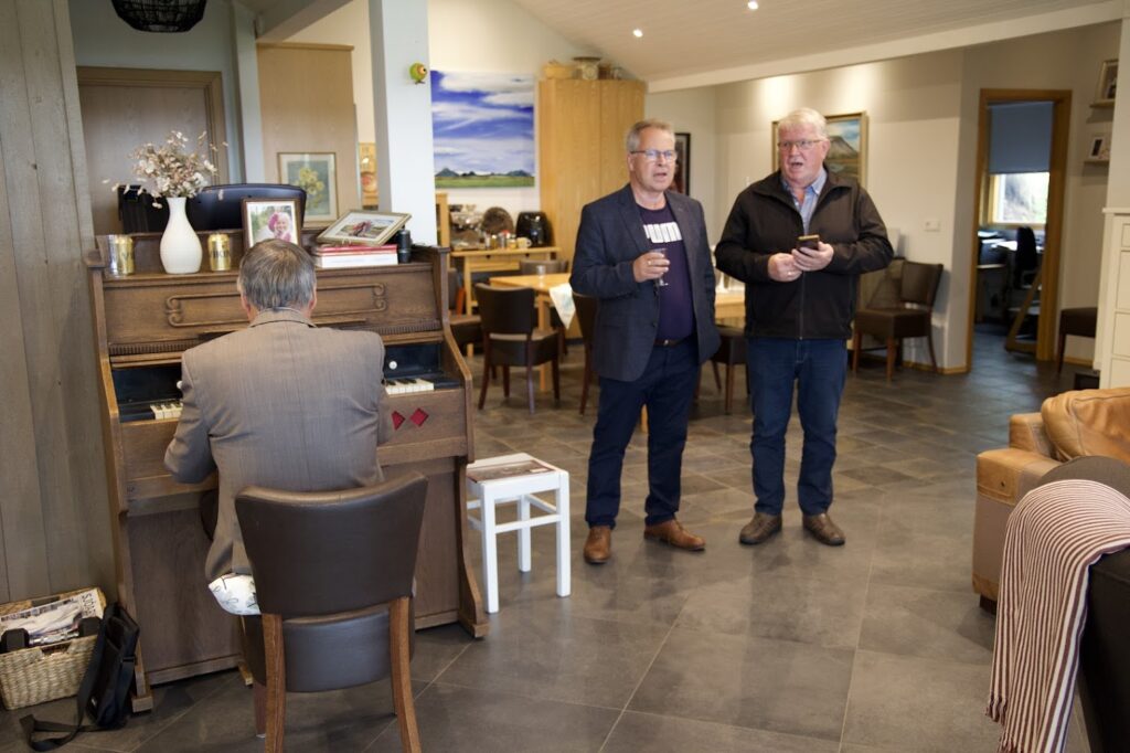 Barnahópurinn þessi var látinn troða upp með söngleik í Aratungu 12 ára gömul. Hann var endurfluttur nú, samkomunni til skemmtunar við kvöldvöku upp við Geysi. Myndin tekin frá söngæfingu í stofunni í Kjarnholtum. Skipuleggjendur mótsins Einar og Eyvindur taka hér örlítið á því á söngæfingu með hópnum. Hjálmur Sighvatsson tónmeistari frá Miðhúsum leikur undir á stofuorgelið.